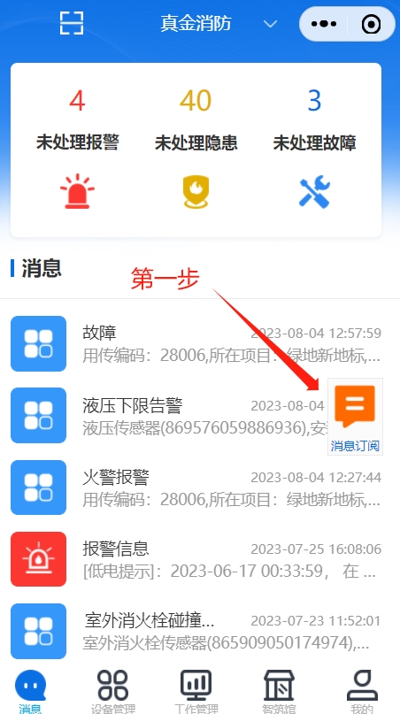第一步:进入智筑安消程序首页点击右边漂浮 “消息订阅”进入要订阅消息列表