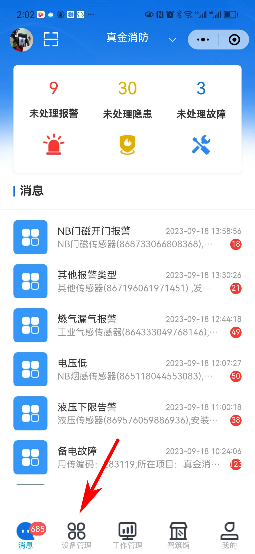 第一步:进入智筑安小程序首页点击底部设备管理。